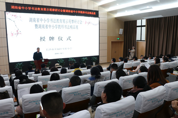 2018年12月26日,湖南省長沙市開福區(qū)實驗小學在湖南省中小學教師發(fā)展中心指導下舉辦了“湖南省中小學書法教育研討觀摩展示會暨湖南省教師書法精品展”。湖南省書法家協(xié)會副主席王希俊,湖南省書法家協(xié)會教育委員會常務副主任羅紅勝,湖南省中小學教師發(fā)展中心副主任李再湘,長沙市開福區(qū)教育局黨委委員、副局長王平等出席了活動。逾百名來自湖南省各書法傳統(tǒng)學校的校長及老師們參加了此次活動。
