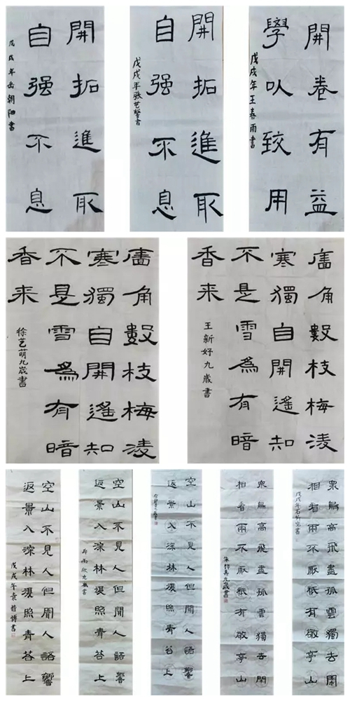 通過一個學期的書法學習,學生創作了四尺四開、四尺三開、四尺對開長條等三種尺寸的隸書作品,書寫質量大幅提升,得到了教師們的認可和家長們的贊許。