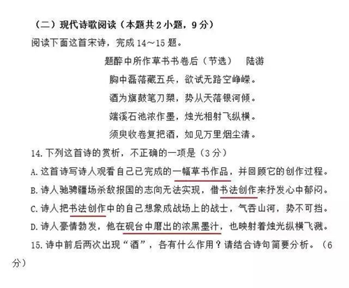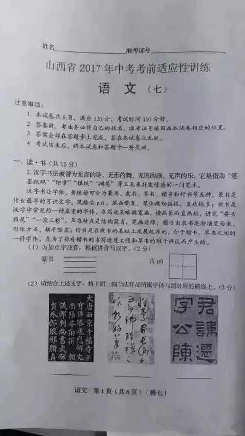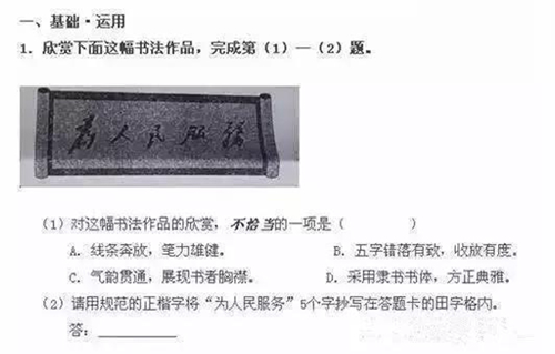 而且書法考試題不僅僅出現在中高考中,還進入了國考,在2016年公務員考試,《行政職業能力測驗》和《申論》中,就包括了大量有關書法方面的知識內容,近幾年出現在中高考試卷中和書法有關等試題,比如: