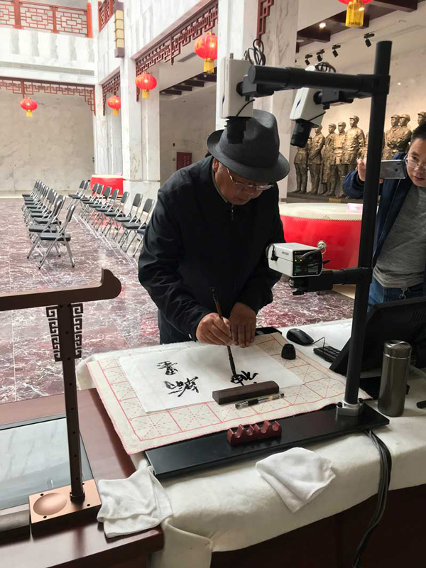 菏澤李榮海美術館名譽館長李榮海在華文眾合智慧書法教室展位即興潑墨揮毫