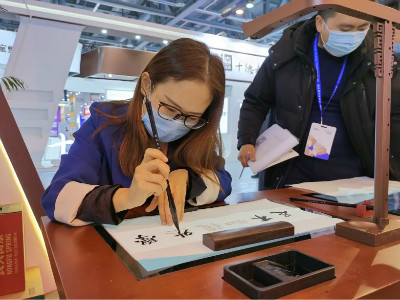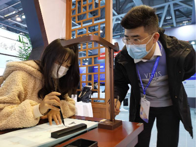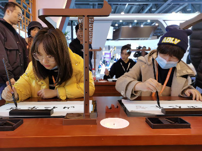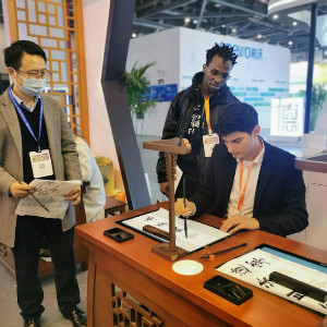 ▲國(guó)際友人體驗(yàn)智慧書(shū)法產(chǎn)品