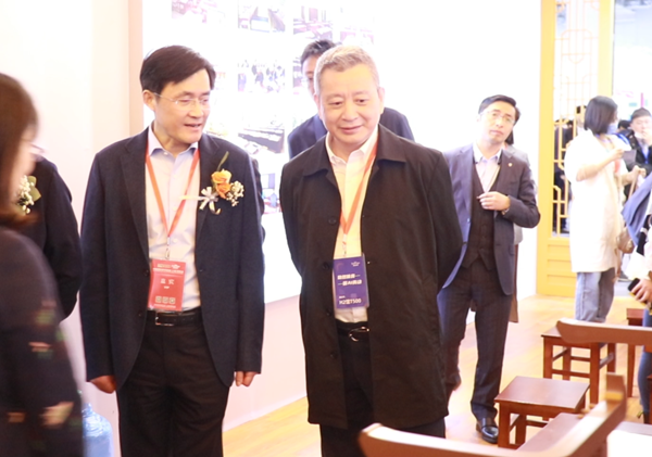 上海市教育委員會副主任王浩(左)、上海教育裝備行業(yè)協(xié)會會長竺建偉(右)參觀指導(dǎo)華文眾合展位
