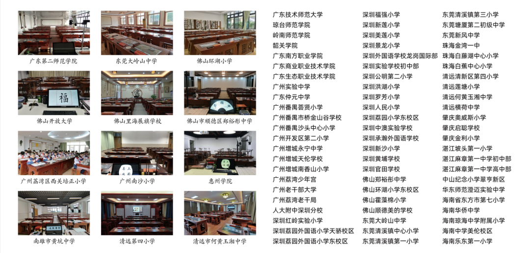 目前,華文眾合智慧書法教室已走進全國4000多所中小學(xué)以及300多所大學(xué),包括清華大學(xué)附屬中學(xué),中國人民大學(xué)附屬中學(xué)及附屬小學(xué)、首都師范大學(xué)等名校。在廣東地區(qū)擁有眾多優(yōu)質(zhì)案例,包括廣東技術(shù)師范大學(xué)、廣州實驗中學(xué)、廣東仲元中學(xué)、廣州開發(fā)區(qū)第二小學(xué)、深圳荔園外國語小學(xué)、深圳福強小學(xué)等。