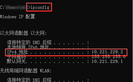 (按Windows鍵+R鍵,輸入cmd,點擊確認,輸入ipconfig,按Enter鍵,查看IP。)