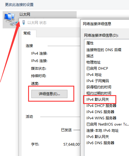 雙擊“以太網”,點擊詳細信息,檢查IPV4默認網關是否正確。