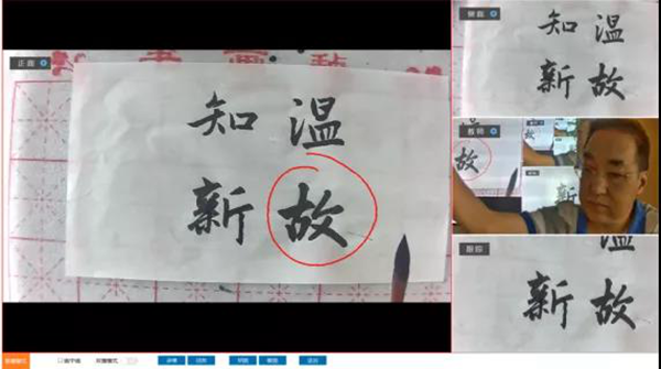 書畫教學展示臺由3臺攝相機組成,正面和側面攝像頭分別從正上方、左上方對書寫過程進行拍攝,特寫攝像頭正前方對教師授課進行怕拍攝,支持手動調焦。