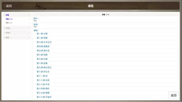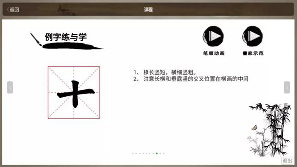 (3)示例:選擇課程長橫,學(xué)習(xí)長橫課程內(nèi)容。例字練習(xí)中可直接播放筆順動畫和書寫示范視頻。