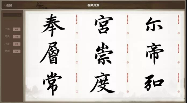(2)左側(cè)搜索框輸入單字或集字進(jìn)行搜索,可根據(jù)書體、筆類、字形、結(jié)構(gòu)進(jìn)行搜索。