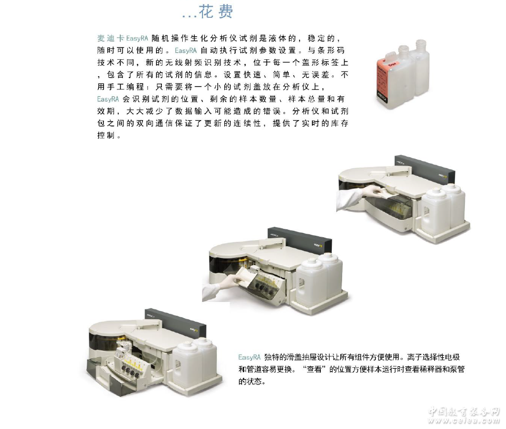 麥迪卡EasyRA是一款適應(yīng)于小型實(shí)驗(yàn)室多樣化需求的全自動(dòng)的生化分析儀。 由于EasyRA簡(jiǎn)單而直觀的用戶(hù)界面,實(shí)驗(yàn)室技術(shù)人員可以通過(guò)最少的培訓(xùn)成為最專(zhuān)業(yè)的人員。4中色彩的圖標(biāo)讓技術(shù)人員輕松訪問(wèn)分析儀功能。EasyRA操作簡(jiǎn)單,運(yùn)行速度快。簡(jiǎn)單友好的用戶(hù)界面清晰地反映機(jī)器運(yùn)行進(jìn)程,用戶(hù)也可以進(jìn)行改動(dòng)。技術(shù)人員可在8分鐘內(nèi)進(jìn)行臨時(shí)標(biāo)本分析。同時(shí)運(yùn)行兩個(gè)工作列表,快捷檢查試劑和測(cè)試管的庫(kù)存準(zhǔn)備下一個(gè)測(cè)試,這樣以來(lái)節(jié)省了寶貴的時(shí)間。 EasyRA臨床生化分析儀可以對(duì)可更換部件進(jìn)行前所未有的訪問(wèn),獨(dú)特的滑屜設(shè)計(jì)簡(jiǎn)化了維修。無(wú)線(xiàn)射頻技術(shù)(RFID)替代了手工編制試劑程序。當(dāng)小巧的試劑包嵌入到試劑區(qū)域任何位置時(shí),EasyRA就可以確認(rèn)試劑包位置、剩余測(cè)試量、容積及失效期。 EasyRA的測(cè)試速度為150次/小時(shí),(集成ISE超過(guò)300次),24個(gè)樣本位,24個(gè)試劑位。EasyRA是實(shí)驗(yàn)室臨床生化項(xiàng)目檢測(cè)是最方便的選擇。 麥迪卡為中小型實(shí)驗(yàn)室提供低成本、易使用、全自動(dòng)的急診生化分析儀。EasyRA就是這樣一款高質(zhì)量低成本的生化分析儀。 EasyRA有一個(gè)簡(jiǎn)單敏感的觸摸屏用戶(hù)界面,操作更簡(jiǎn)單,方便培訓(xùn)任何水平的用戶(hù)。用戶(hù)界面方便用戶(hù)查詢(xún)所有的維修記錄。模塊化的設(shè)計(jì)方便用戶(hù)和服務(wù)工程師進(jìn)行維修,保證了最大儀器運(yùn)行時(shí)間。試劑應(yīng)用了最新的無(wú)線(xiàn)射頻識(shí)別(RFID)芯片,記錄了所有測(cè)試信息,提醒用戶(hù)進(jìn)行校準(zhǔn),自動(dòng)使用情況追蹤和試劑存量管理。 |