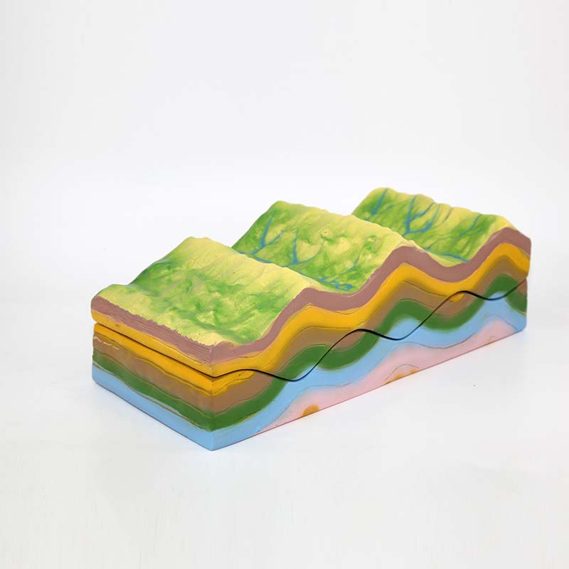 本模型直觀演示巖層在水平擠壓作用下形成的背斜、向斜等褶皺構造,以及后期在外力侵蝕、堆積作用下的地貌演變過程,清晰呈現背斜成谷、向斜成山等地貌倒置現象。結構逼真、過程連貫,適用于中小學地理課堂教學與地質科普,幫助學生理解褶皺構造與地表形態的形成規律。