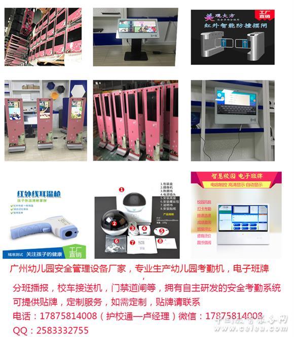 產品詳細介紹廣州護校通電子科技有限公司專于幼兒安防設備,擁有自主研發的幼兒園考勤系統,生產幼兒園安防設備多年,幼兒園防設備產品豐富多樣,有幼兒園刷卡機,電子班牌,分班播報機,校車刷卡機,道閘,在線監控,教學一體機等。主要為客戶提供長期供貨,定制生產,貼牌等業務。 護校通擁有4000方生產廠房,300方營銷中心,位于廣州市番禺區,廠房員工一百多人,有著專業的生產知識和豐富經驗。廠房配備大型生產設備,設備沖床,折彎機,激光切割機等,生產效率極高,產量大,月均1500臺,質量好。營銷中心擁有專業的技術,銷售,售后團隊,為客戶提供全方位的服務。 護校通旗下的幼兒園刷卡機有三大安裝方式:壁掛式,立式弧度,立式。四大尺寸:10.1寸15.6寸21.5寸32寸。 幼兒園刷卡機參數: 1.系統版本:Android 4.4及以上。 2.攝像頭功能和智能刷卡功能; 3.內置高品質音箱喇叭,音色完美; 4.金屬質感,新款高檔模具! 5.鏡面鋼化玻璃面板,高端大氣,有效保護液晶屏幕; 6.工業級散熱標準,延長機器使用壽命; 7.操作簡單,系統穩定; 8.CPU:全志A20雙核處理器/A31四核處理器/A83八核處理器 9.運行內存:1G/2G 10.機身內存:4G/8G 11.顯示:原裝顯示屏、高清分辨率 11.有線網絡:RJ45 12.無線網絡:支持WIFI 13.數據傳輸協議:TCP/IP通訊協議 14.電源:AC 220V 15.使用環境溫度:(-10℃) -70℃ 濕度10%-90% 16.視頻攝像:200萬像素,廣視角達130度,高清彩色攝像頭 17.USB接口:USB2.0高速接口