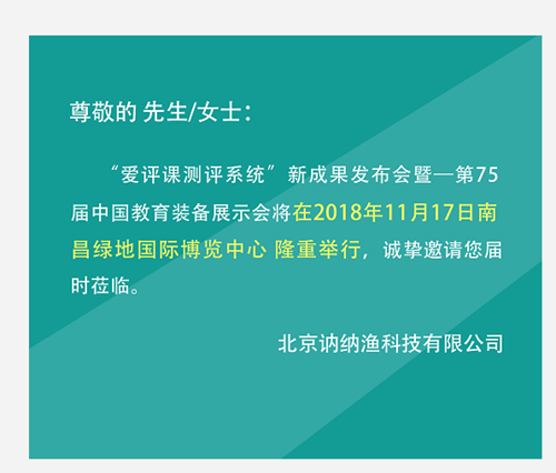 “愛評課測評系統”新成果發布會——暨“第75屆中國教育裝備展示會”將在2018年11月17日,南昌綠地國際博覽中心隆重舉行!