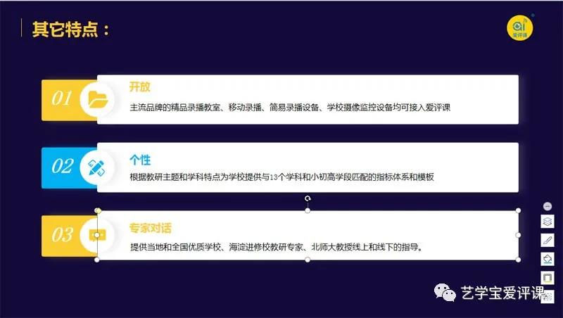 | 擁有自主開發(fā)的系列產品,涉及中國傳統(tǒng)文化書畫教室、老師成長和提升的教研產品、增賦減負備授課工具、提升優(yōu)質資源均衡的結對課堂。自主研發(fā)產品:課堂評價-愛評課、美術教絡系統(tǒng)-藝學寶、數(shù)字臨摹書法教室-藝學寶、互動結對課堂、名師專遞課堂。配套硬件產品:藝板繪畫屏、藝學寶書法臨摹全貼合屏,產品優(yōu)勢:數(shù)據(jù)采集與運用、互聯(lián)網(wǎng)+等創(chuàng)新運用在教學和教研,助力英音美薄弱學科的師資水平提升和名師課堂發(fā)揮普惠作用。 |