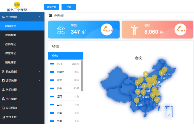 可以實時查看各科教師的課堂實錄、教學模式、S-T行為分析、課堂教學行為、課堂參與度評價等情況; 支持常態評課 、賽課模式、磨課模式,支持專家線上指導:1)遠程診斷和輔導;2)線上說課活動:說課活動技術保障、策劃組織、展示、評選、專家評價。3)教研工作成果固化和匯編工作;4)線下研修:講師團組織、教育教學管理層、學科骨干老師之間的面對面教學觀摩、座談交流。