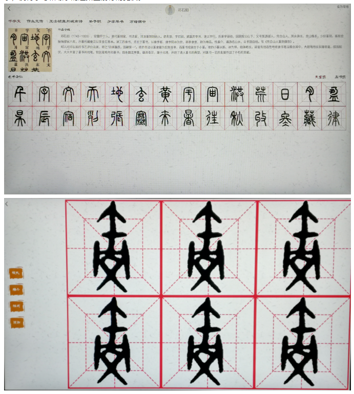 書法教學系統:先秦至近代高清碑帖資源放大或縮小,摹帖按年代、書體、作者自由檢索;內置書法文化知識,書法發展簡史、歷代作品賞析、歷代書論、書法家故事;字帖排版、字帖檢索、視頻展現、動畫演示、單鉤雙鉤的轉換、書體混排、格數變換、一鍵推送推送至學生端臨摹屏;學生作品展示、圈注點評、保存記錄、對照;集字功能,橫排、豎排、扇面、斗方、條幅一鍵推送至學生端實現集字創作和臨摹。