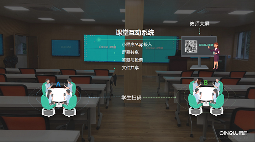 其次,青鹿高校方案支持手機(jī)、平板、電腦端(BYOD)接入,其課堂互動系統(tǒng),支持小程序、APP接入,屏幕共享、答題與投票、文件共享等功能,學(xué)生掃碼即可進(jìn)入課堂。