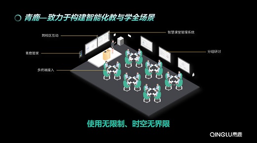 青鹿的無限課堂主要包含智慧課堂管理系統(tǒng)、多屏分組研討系統(tǒng)、跨區(qū)域互動系統(tǒng)、多終端接入系統(tǒng)、以及青鹿管家(智能管控)。由這些系統(tǒng)共同構建的全場景智能化教學空間,讓師生體驗到“時空無界限,使用無限制”的智能化教學模式。