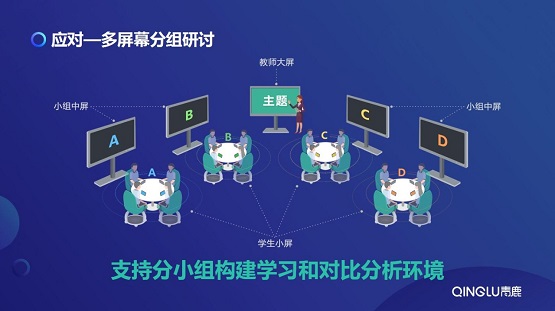 在多屏研討的教學(xué)場景下,教師通過課堂分組,實(shí)現(xiàn)課堂當(dāng)中的三屏互動,讓每個小組成員自由分享學(xué)習(xí)成果,構(gòu)建小組探究、自主學(xué)習(xí)的智慧學(xué)習(xí)環(huán)境。