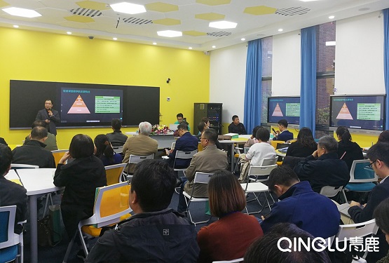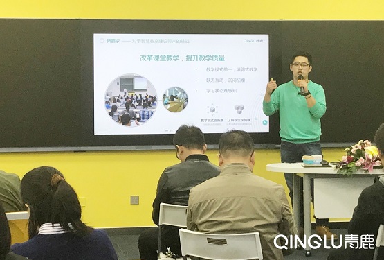 在展示互動體驗前,青鹿智慧教育研究院的廖力院長就現階段大學課堂中存在的危機、課堂革命的含義以及如何建設“金課”等內容向現場的領導專家們做了介紹,最后廖力院長根據英語學科的特征結合青鹿智慧課堂的功能特點,分享了創意英語課的一些建議,受到了現場領導專家們的認可。