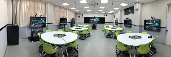 智慧教室分組布局靈活多變,師生們可以根據課堂教學環節的需要進行自由組合。在分組教學過程中,學生可以通過手機等智能設備,連接到課堂中參與小組討論,學生手中的“小屏”、每個小組設置的“中屏”以及教室前方的大屏之間可以進行輕松投屏互動。