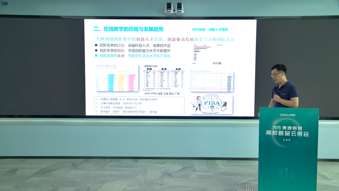 劉廣博士圍繞“后疫情時代,教學(xué)改革的趨勢與學(xué)習(xí)空間建設(shè)實踐”這一話題,針對“COVID-19疫情的影響”、“在線教學(xué)的歷程與趨勢”、“學(xué)習(xí)空間的標(biāo)準(zhǔn)化建設(shè)”三大主題為大家進(jìn)行了詳細(xì)的講述。疫情之下的教育教學(xué)如何展開,成為了眾多教育者思考的問題。教育行業(yè)整體在這時遭遇了危機(jī),線上教育則迎來了在變局中開新局的重要機(jī)會。隨著科技的快速發(fā)展,傳統(tǒng)的線下教育顯露出了諸多弊端,例如教育制度僵化、同質(zhì)化和缺乏個性化以及大班教學(xué)的方式抑制了學(xué)習(xí)的個性化和學(xué)習(xí)的廣度。通過線下與線上教育相結(jié)合的方式,這一系列弊端將會漸漸被革除,這樣做最直接的受益者是受教育者與教育者雙方:教育者通過信息技術(shù)的支持對受教育者進(jìn)行靈活化的教學(xué),受教育者也在其中進(jìn)行個性化的學(xué)習(xí)。這樣靈活的教學(xué)與個性的學(xué)習(xí),將使受教育者的創(chuàng)新思維逐步得到培養(yǎng),也將大大提高受教育者的創(chuàng)新水平。在國家發(fā)展中,從大國到強(qiáng)國的轉(zhuǎn)變中,創(chuàng)新人才的培養(yǎng)、創(chuàng)新驅(qū)動的發(fā)展成為當(dāng)下的國際共識,通過多組數(shù)據(jù)分析,劉廣博士從我國創(chuàng)新競爭的過去講述到創(chuàng)新競爭的未來。在未來,中國學(xué)生學(xué)業(yè)水平將處于領(lǐng)先地位。而在這一發(fā)展變化過程中,線上教育的介入,智慧課堂的建設(shè)發(fā)揮了不容忽視的作用。未來教育的發(fā)展將展現(xiàn)新的教學(xué)生態(tài),主要體現(xiàn)在“全體、全人、全流程”,教學(xué)目標(biāo)將鎖定在培養(yǎng)學(xué)生的核心素養(yǎng)與創(chuàng)新能力,教學(xué)技術(shù)將需要富媒體、數(shù)據(jù)支持、AI的幫助,這一切都與青鹿產(chǎn)品的設(shè)計理念不謀而合。當(dāng)前,我國出臺了相關(guān)法典--《中華人民共和國標(biāo)準(zhǔn)化法》,里面包含了12項教育行業(yè)標(biāo)準(zhǔn),針對教育信息化、智慧教學(xué)、多媒體教學(xué)等都提出了相關(guān)要求。從這一切不難看出,線上教育在適應(yīng)著教育發(fā)展新趨勢。