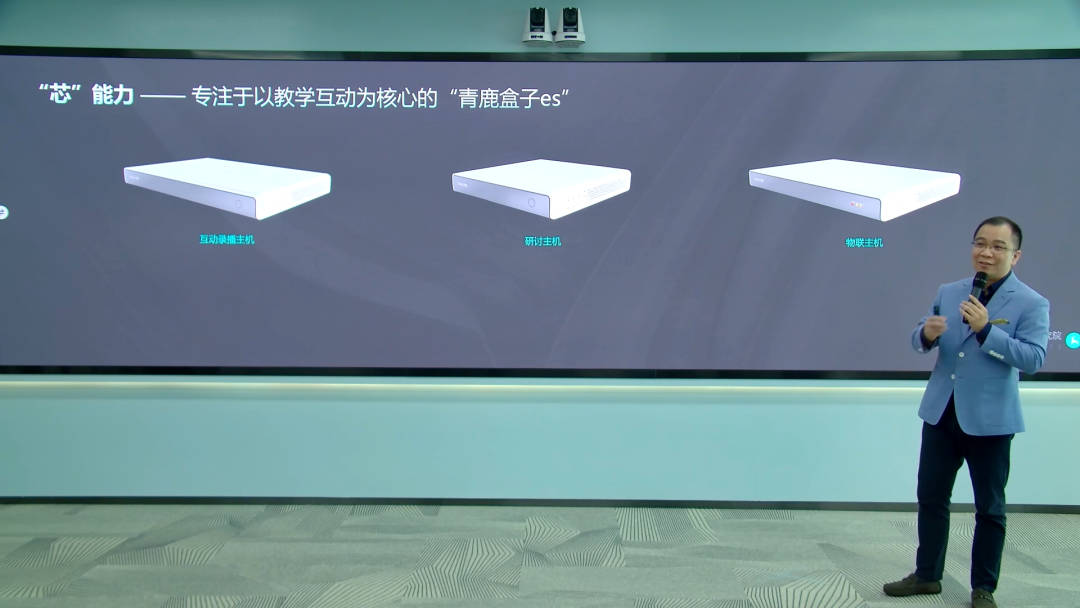 在緊接著的直播中,青鹿研究院院長廖力先生圍繞主題“科技啟迪教育智慧”向大家進(jìn)行闡述。通過對國家大事件的回顧,可以明確當(dāng)前我國在教育方面聚焦課程質(zhì)量、教學(xué)管理,推進(jìn)系統(tǒng)性的改革。隨著社會的飛速發(fā)展,教育現(xiàn)代化的發(fā)展趨勢越來越顯著,主要體現(xiàn)在教育要立德樹人,從學(xué)革命到質(zhì)量革命,推進(jìn)人才培養(yǎng)模式變革。而當(dāng)前,青鹿為教育發(fā)展提供支持線上、兼容線上線下混合教學(xué)的信息化產(chǎn)品。新時代,教育信息化發(fā)展面對著新的機(jī)遇與新的挑戰(zhàn)。在機(jī)遇與挑戰(zhàn)并存的階段,青鹿提出了新思路,推出了一檔以專業(yè)視角解構(gòu)建設(shè)思路、規(guī)劃方案的中立欄目——《大家講堂》,旨在通過“大家”的分享、交流和碰撞,啟迪從業(yè)者,傳遞創(chuàng)新價值。廖力先生強(qiáng)調(diào)青鹿期望持續(xù)地請大家來講,通過大家關(guān)心的話題,講給大家聽。而要在教學(xué)上做到這一切,使用青鹿專注于教學(xué)互動為核心的“青鹿盒子系列產(chǎn)品”將事半功倍。當(dāng)前“青鹿盒子系列產(chǎn)品”有互動錄播主機(jī)、研討主機(jī)、物聯(lián)主機(jī)三款明星產(chǎn)品。三款產(chǎn)品是基于教學(xué)過程中不同方面的需求進(jìn)行研發(fā)的,例如,互動錄播主機(jī)基于視頻互動的教學(xué);研討主機(jī)面向小組的研討式、探究式、自主分享式學(xué)習(xí)等。面對新時代的教育,青鹿提出新方法——依托校園信息化構(gòu)造教學(xué)場景,采用新模式——整體方案全面升級,使用新科技——全過程數(shù)據(jù)自動記錄,整體構(gòu)建有機(jī)融合的信息化教學(xué)環(huán)境,利用科技賦能創(chuàng)新教學(xué),最終達(dá)到從科技到智慧的目的。