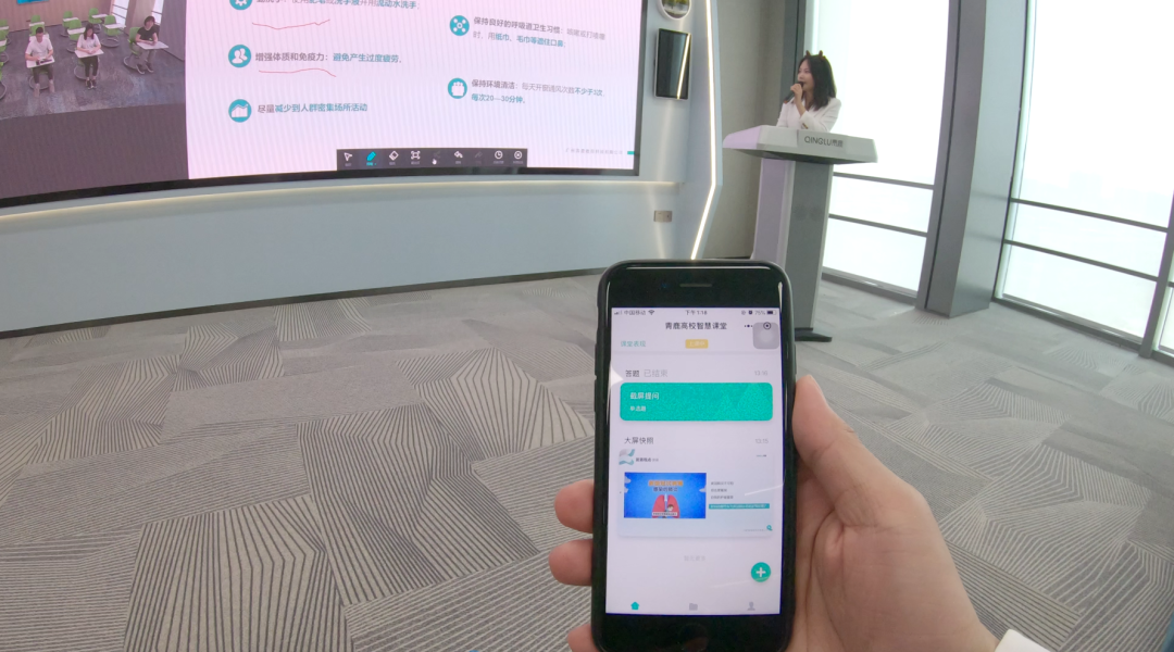 在次日的智慧教學(xué)示范空間·云參觀直播中,青鹿的工作人員帶領(lǐng)大家參觀了青鹿線下的智慧課堂,向觀眾們介紹了青鹿各項線上技術(shù)平臺。其中,線下的智慧課堂包括“手機(jī)互動智慧教室”、“多點互動智慧教室”以及“研討互動智慧教室”,手機(jī)互動與多點互動智慧教室具有操作簡單易上手、主流設(shè)備無障礙接入、跨校區(qū)遠(yuǎn)程互動等特色功能,完美解決了多校區(qū)師資不足、遠(yuǎn)程聯(lián)合辦學(xué)等教學(xué)問題。而研討互動智慧教室則使小組討論式學(xué)習(xí)更加高效,學(xué)生通過各項移動設(shè)都可以參與到課堂當(dāng)中,學(xué)生與老師之間思維的碰撞,使得課堂充滿活力。在這其中,工作人員還向我們介紹了“青鹿智慧學(xué)習(xí)島”,通過學(xué)習(xí)島,老師與學(xué)生之間可以高效分享知識,深度探討內(nèi)容。另外,在研討互動智慧教室中,無論是各個大中小屏,還是窗簾、空調(diào)都可以通過教室中的管控設(shè)備進(jìn)行操控,以此來滿足老師授課時的各項需求。