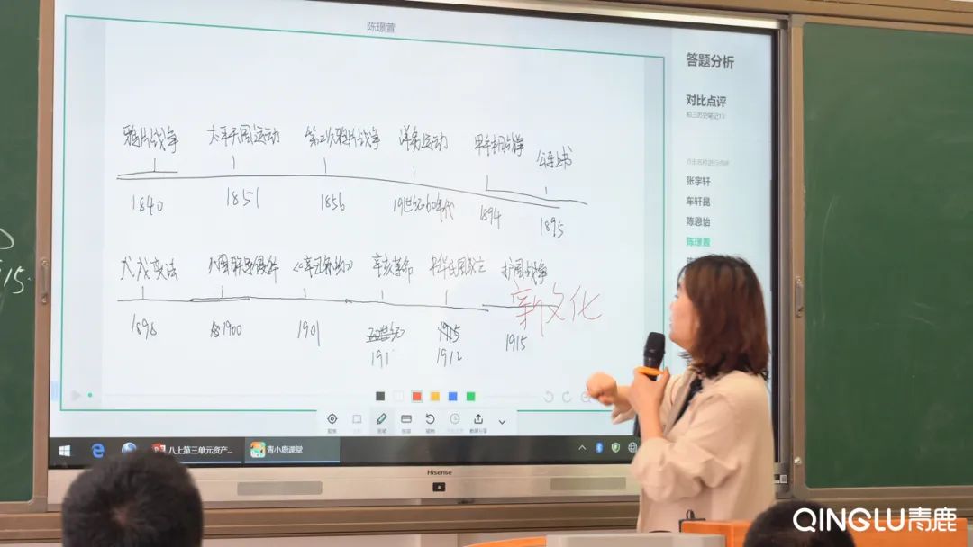 比如,歷史卞老師在課堂上通過青小鹿智慧紙筆系統下發截屏提問,讓學生用紙筆繪制中國近代史的時間軸(1840年-1915年)。在學生完成作答后,老師在教室大屏上隨機選擇學生的作答畫面進行點評與糾錯,課堂反饋高效又直觀。