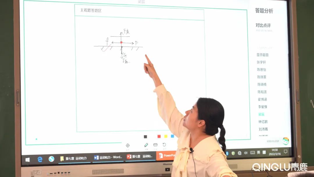 在物理課上,呂老師給學生下發了繪制木塊受力示意圖的任務,在對學生作答內容進行知識講評時,老師不僅會查看答案是否正確,還會通過筆跡回放功能來了解學生在分析受力時的思路,并進行針對性講解。
