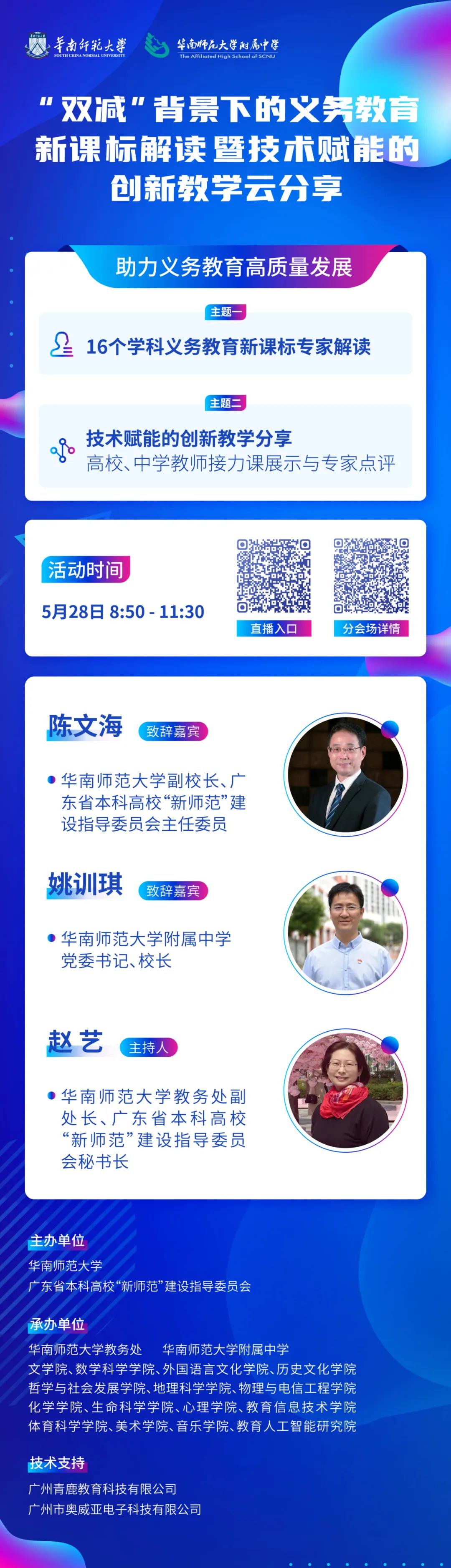 為了更好地助力義務教育高質量發展,廣東省本科高校“新師范”建設指導委員會聯合華南師范大學組織主辦“雙減”背景下的義務教育新課標解讀暨技術賦能的創新教學云分享活動,并將于5月28日上午8:50-11:30進行在線直播分享。