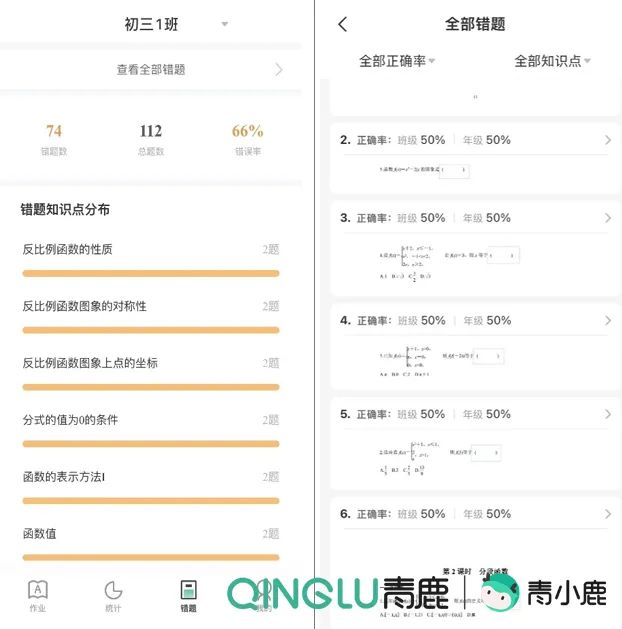 通過采用信息化技術的青小鹿智慧作業,教師無需自行歸納統計,便能快速獲取到各班級的錯題,減少在重復、機械工作上的投入,可將精力聚焦在錯題分析與改題訓練上。