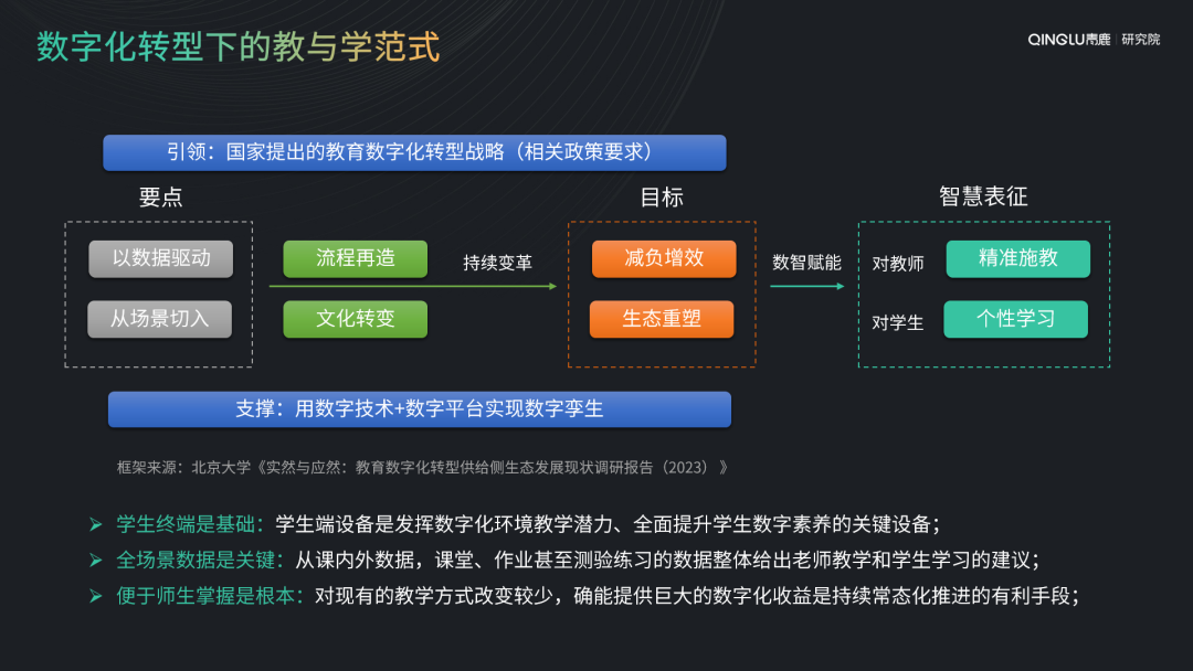 青鹿廖院長引用北京大學《實然與應然:教育數字化轉型供給側生態發展現狀調研報告(2023)》的理論框架,提出了對數字化轉型下教與學范式的新思考,并展開了青鹿基于智能學生終端的數字化教學實踐的分享。