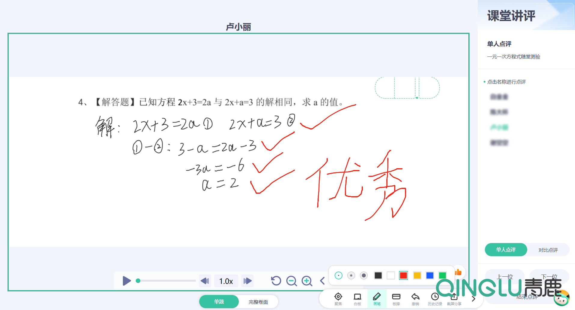 測試完成后,青鹿智慧紙筆系統將識別并統計客觀題的手寫答題情況,主觀題答案則支持筆跡回放和對比點評。同時,針對主觀題的批改,系統支持教師通過智能筆直接在測練卷中批改并智能識別,實現批改留痕;教師也可通過在線批改的方式為學生進行評價打分。