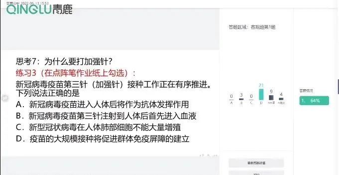 客觀題還能自動批改生成結果與統計,并且可以顯示班級整體的作答正確率和每個選項選擇的人數。