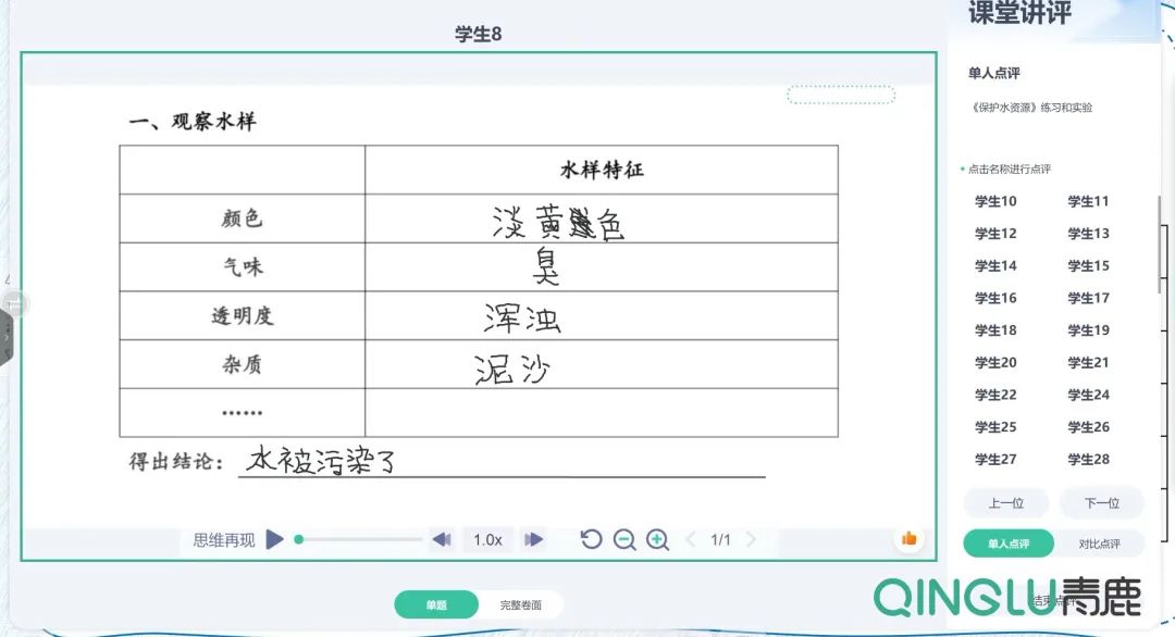 在活動探究時,學(xué)生使用青鹿智能筆記錄實驗過程與探究結(jié)果,數(shù)據(jù)實時傳輸至一體機大屏顯示,林老師能及時了解學(xué)生們的實驗情況,更有針對性地講解知識點與解答問題。