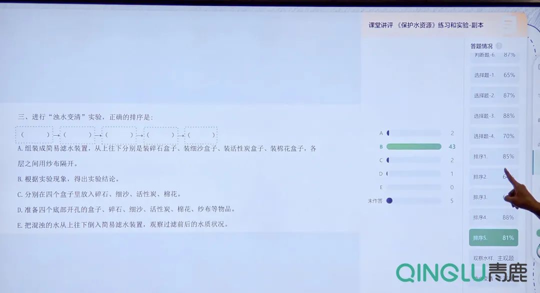 課程尾聲,林老師通過青鹿智慧紙筆系統(tǒng)下發(fā)練習(xí)題,幫助學(xué)生及時鞏固知識、發(fā)現(xiàn)學(xué)習(xí)薄弱點。系統(tǒng)將自動批改客觀題,并即時統(tǒng)計正確率,班級學(xué)情一目了然。