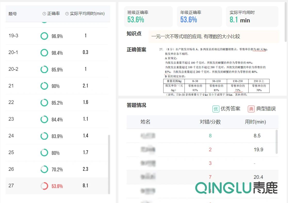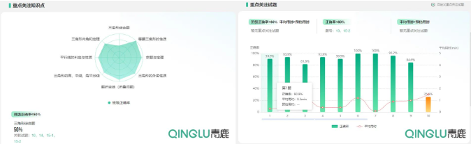 在青鹿智慧作業(yè)的作業(yè)試題分析模塊,精準反饋每道作業(yè)題目的正確率,提示教師需重點關(guān)注的班級共性薄弱知識點等,教師能夠更加精準地了解學(xué)生知識盲區(qū)。