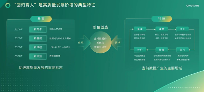 青鹿認為,當前教育數字化轉型進入價值創造階段,這一階段的目標將更貼近回歸教育的育人本質,并以“全域數據的系統化收集與分析”為重要表征,聚焦數據賦能因材施教的實現。