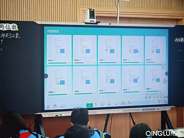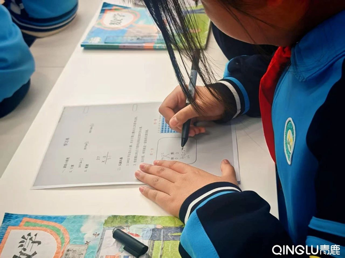 課前,張雨晴老師針對本堂數學課知識點設計學習單。課堂上,通過青鹿智慧紙筆系統下發學習任務,學生使用智能筆在學習單上書寫。張老師可通過教師大屏實時查看學生作答情況,也可借助系統的思維再現功能回溯學生解題過程,掌握學生的解題思維。張老師通過對比展示、挑選典型案例講解,拓寬學生思維,精準定位認知盲區,讓講解直擊痛點,實現“數據驅動”的靶向教學。