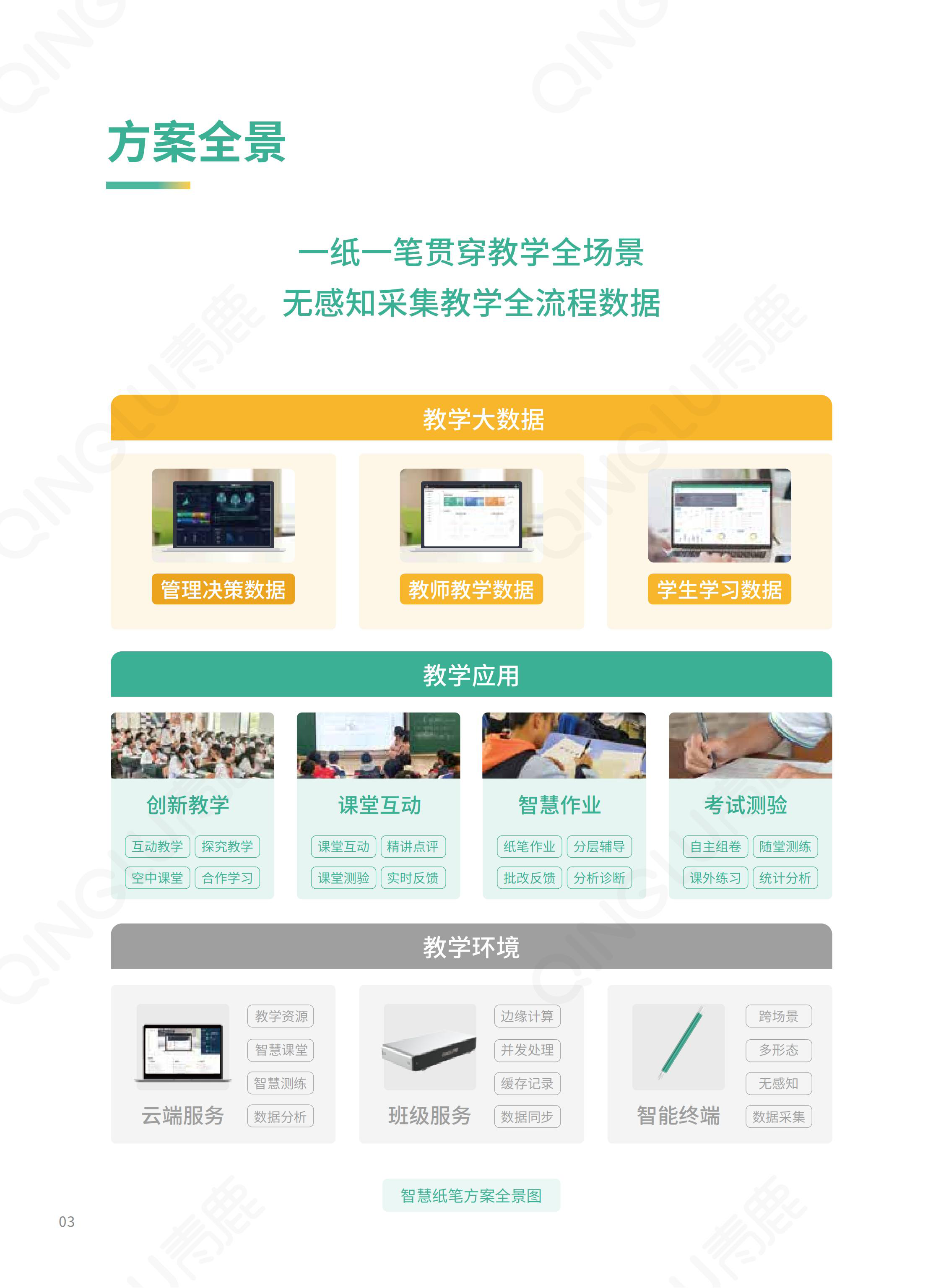 | 智慧教育信息化整體解決方案提供商,我們提供集智慧紙筆課堂、智慧錄播為一體的智慧教學環境,提供一套可廣泛應用于K12學校信息化整體建設的開放式底層平臺,為學校的教學和管理質量提升提供支撐,賦能教育的數字化轉型。 |