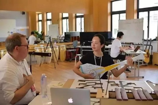 (云谷藝術周圖片:美國紐約大學的Alex教授攜其團隊向學生展示變廢為寶:廢舊紙板、錫紙、電線,稚拙的繪畫點綴,最后成為簡易“樂器”。)