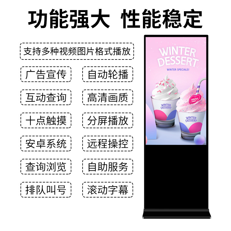 產品詳細介紹1)超薄機身4.5cm, 3cm超窄邊框,鋁合金烤漆工藝。正面采用4mm的鋼化玻璃,防刮,防爆 2)無按鍵設計,結合機身散熱部位,設計密集多網孔,散熱降溫效果好!網孔內設置了防塵網,達到很好的防塵效果 3)LG液晶屏,高清顯示,色彩亮麗,畫質清晰 4)安卓版跟網絡版兩種主板可供選擇 5)一線大牌的觸控技術,反應靈敏,無斷點,穩定性強 6)采用最新的LED顯像技術,功耗低至100W,節能環保,經濟實惠 7)質保一年,全國聯保,終生免費提供售后及技術支持