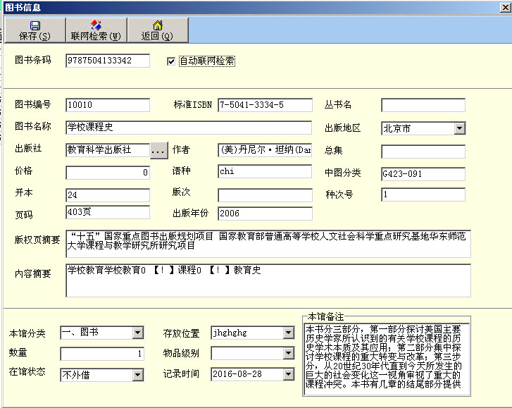 軟件特點: 1、操作簡單靈活。易學易用,易于維護 2、系統可自動聯網下載圖書資料,免除自編圖書資料的麻煩。 3、支持多種讀卡設備。 4、可直接控制條碼打印機打印書標、圖書館藏條碼,書標條碼制作更靈活。一套設備完成圖書館管理的所有工作。 5、書標、條碼樣式可由用戶自己定義。 6、圖書、期刊、讀者、借閱記錄支持Excel數據導入、導出。方便用戶數據遷移。 7、支持自動升級,升級免費。 |