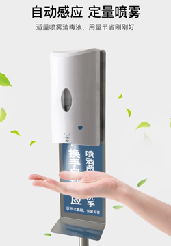 產品詳細介紹手部感應消毒機,鋁制可升降支架,可使用6節5號電池或直接插電源,電池可使用3200次左右,可灌注1000ml消毒液,噴一次2ml左右,加一次消毒液可噴500次左右。