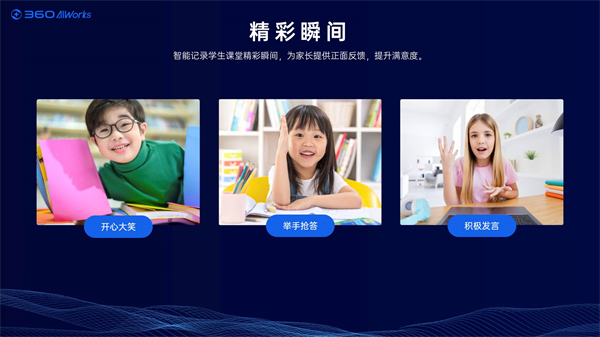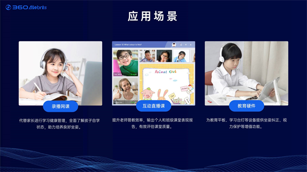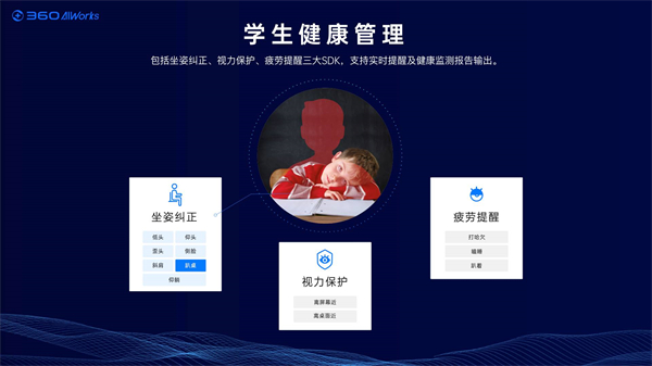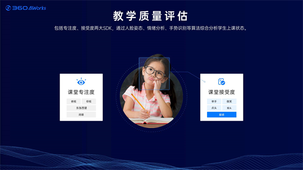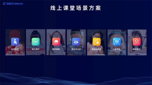 360在線教育AI學(xué)情分析學(xué)生端解決方案包括課堂專注度分析、課堂接受度分析、人臉考勤、坐姿糾正、視力保護(hù)、疲勞提醒、精彩瞬間視頻等,適用于線上直播、錄播課,及各種教育硬件學(xué)習(xí)場景。