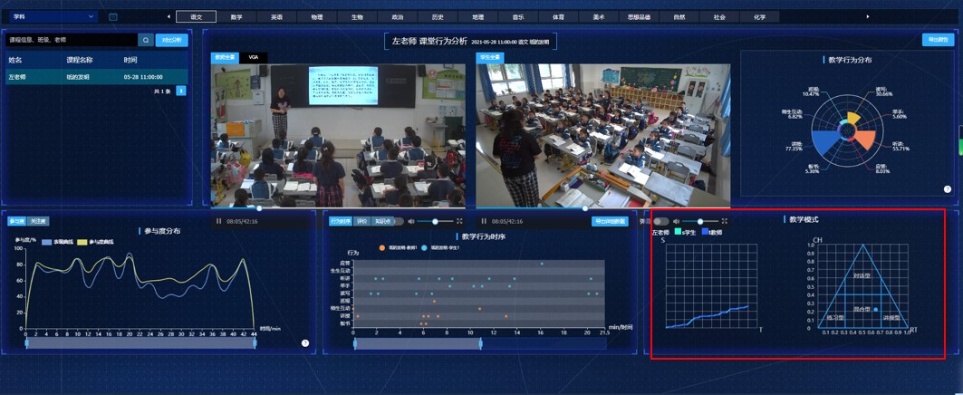 目前,現代中慶基于人工智能與常態化錄播融合開發的中慶智課系統和智能研修平臺經過了高校論證和專家評審,已經具備了有效采集和分析課堂學情數據的能力。具體體現在采集和分析課堂教學行為數據,即教師和學生的9種行為占比和分布,課堂S-T行為圖和課堂類型判定,學生課堂參與度、專注度曲線,和聽評課結合的教師能力矩陣等多個方面;同時,數據范圍不僅包括課中,還前延到教師備課和磨課的環節。