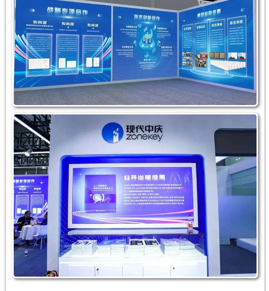 AI教研應(yīng)用成果展區(qū)展示了現(xiàn)代中慶與教育部級項目、全國師范類院校的戰(zhàn)略合作,并產(chǎn)出典型應(yīng)用與公開出版等多項成果。