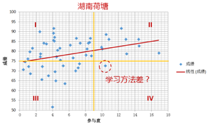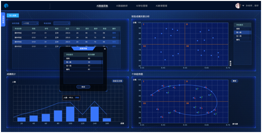 系統可以與學�?荚囅到y進行對接,通過對學生個體考試成績與課堂關注度的關聯分析,系統可以繪制出學生成績與課堂參與度的四象限散點分布圖。