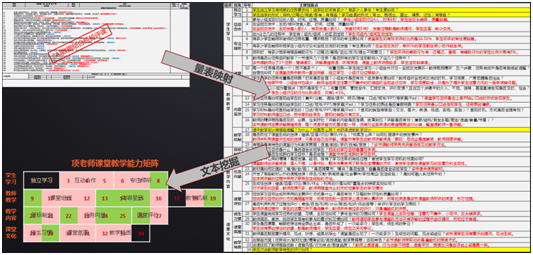 1)教研員基于預置的課堂評價量表進行經驗初評,系統將課堂教情數據和教研員經驗評課的內容映射到統一的教學評價量表中,可以自動生成教師教學的能力矩陣,直觀顯示教師突出方面和待改方面。
