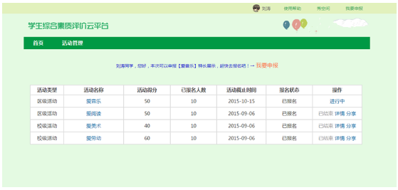學(xué)生自主參與,主動(dòng)申報(bào)評價(jià):尊重學(xué)生個(gè)體差異、個(gè)性發(fā)展,每個(gè)學(xué)生都能講自己學(xué)習(xí)、生活中的點(diǎn)滴上傳平臺(tái)。學(xué)生由傳統(tǒng)被動(dòng)評價(jià)轉(zhuǎn)為積極主動(dòng)參與、展示,充分調(diào)動(dòng)學(xué)生的積極性,促進(jìn)學(xué)生發(fā)展進(jìn)步。